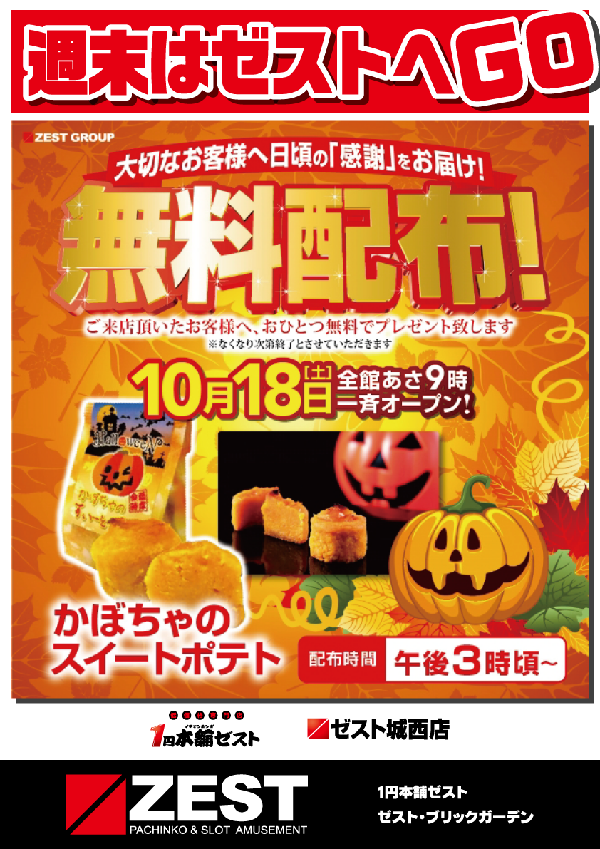 【1円本舗&ゼスト城西】10月18日かぼちゃのスイートポテト無料配布