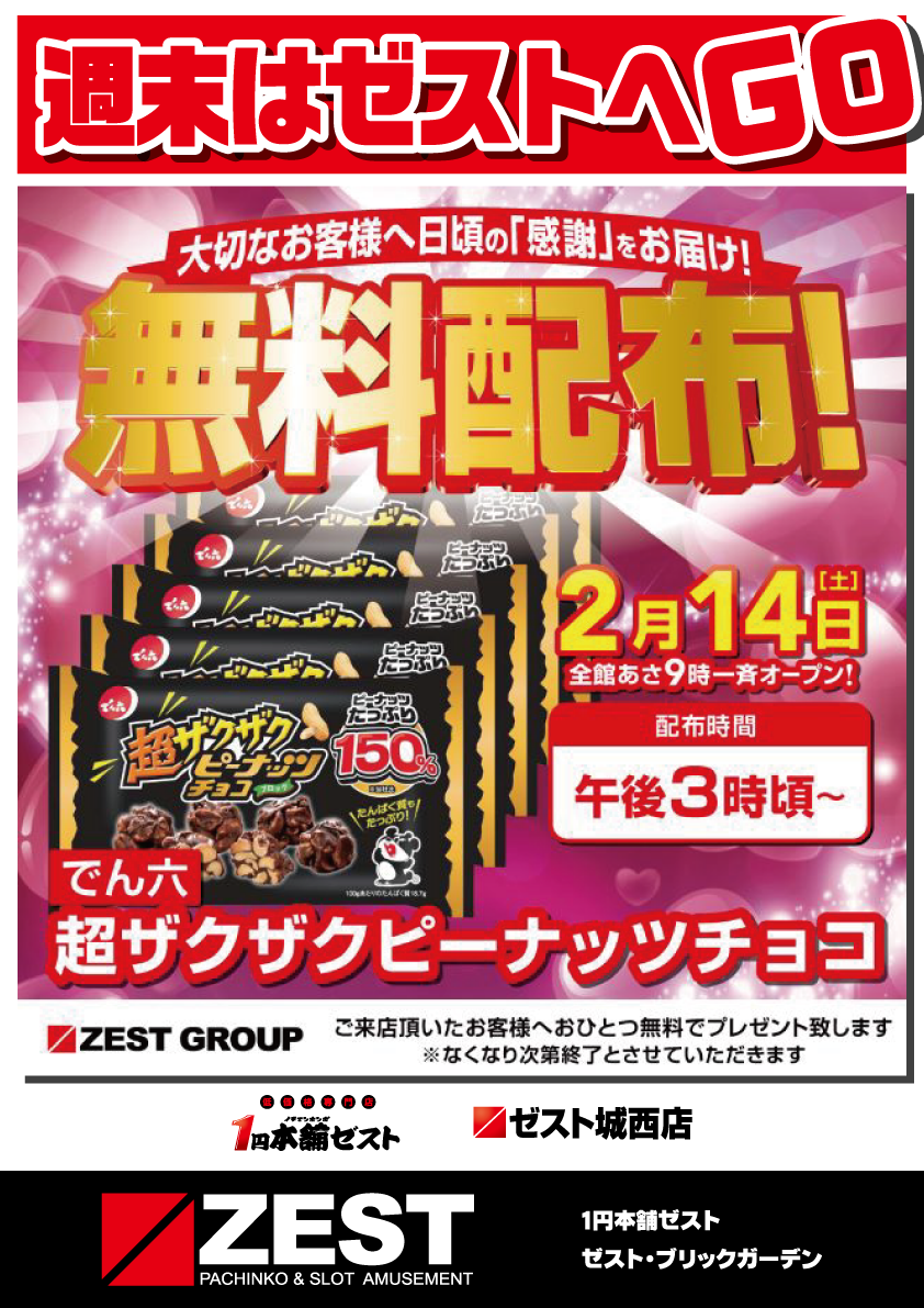 【1円本舗&ゼスト城西】2月14日ピーナッツチョコ無料配布!