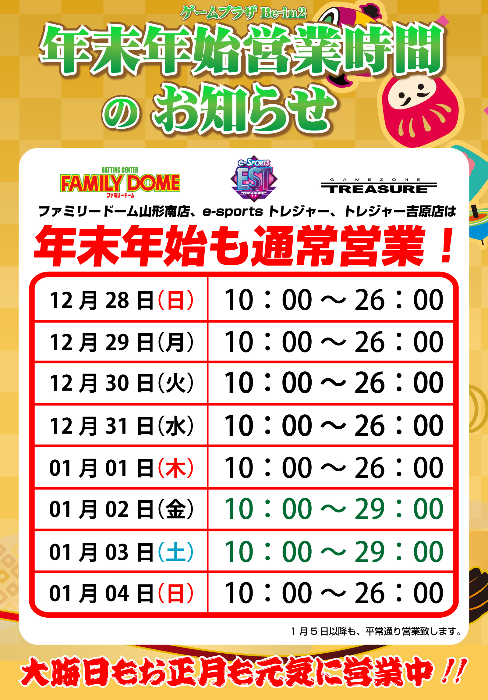 年末年始の営業時間のご案内