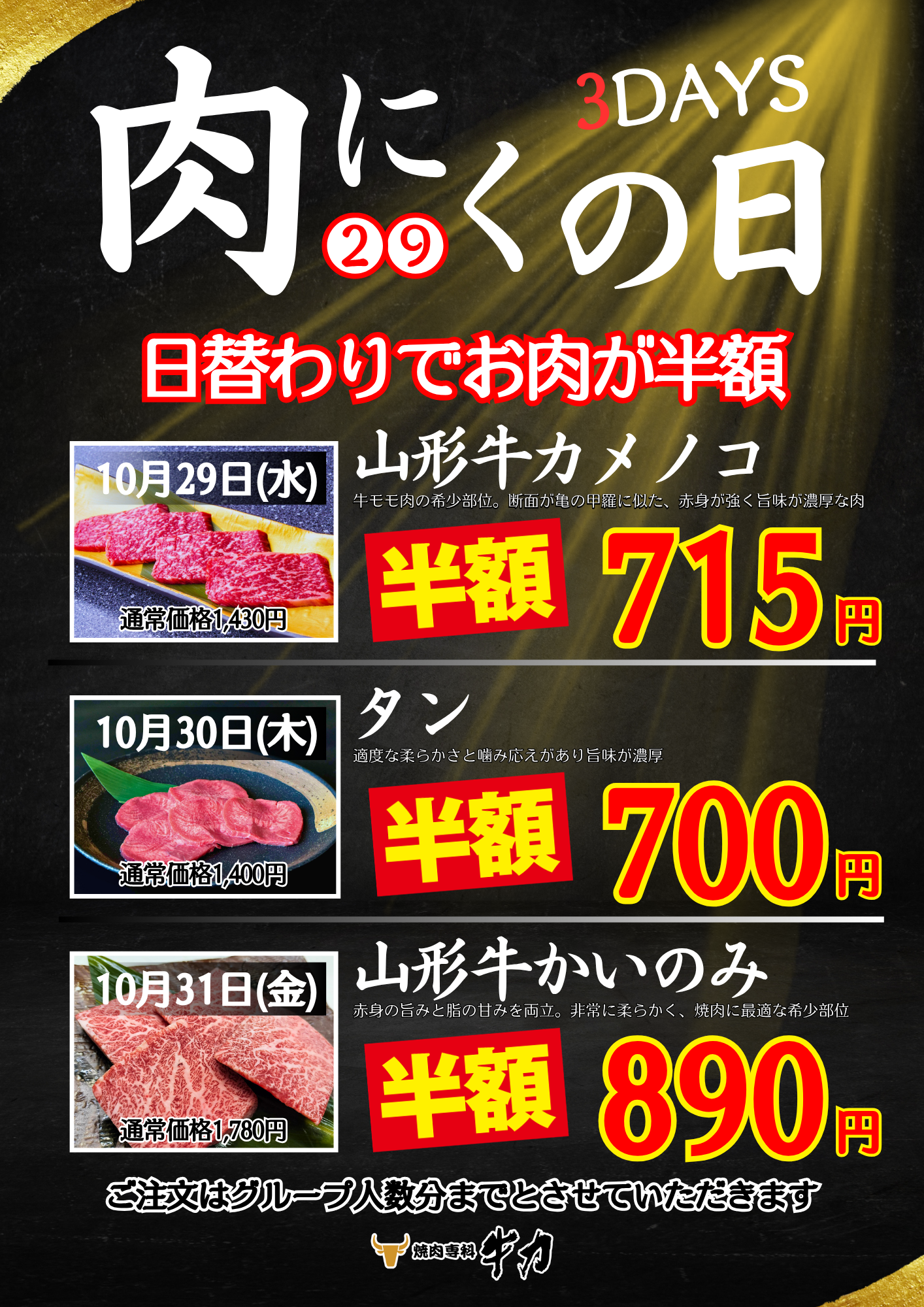 10月29日~31日は肉の日!日替わりでお肉半額!