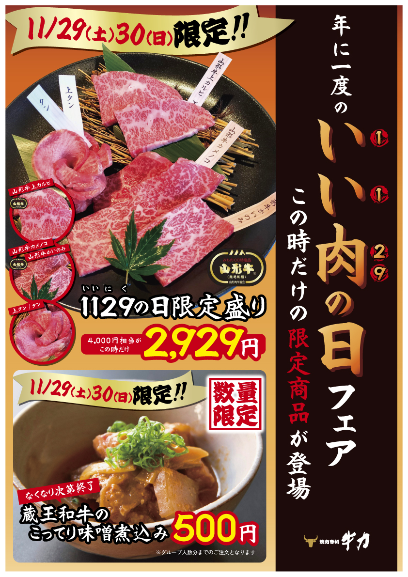 ホーム  >  焼肉専科 牛力  >  11月29日 年に一度のいい肉の日!