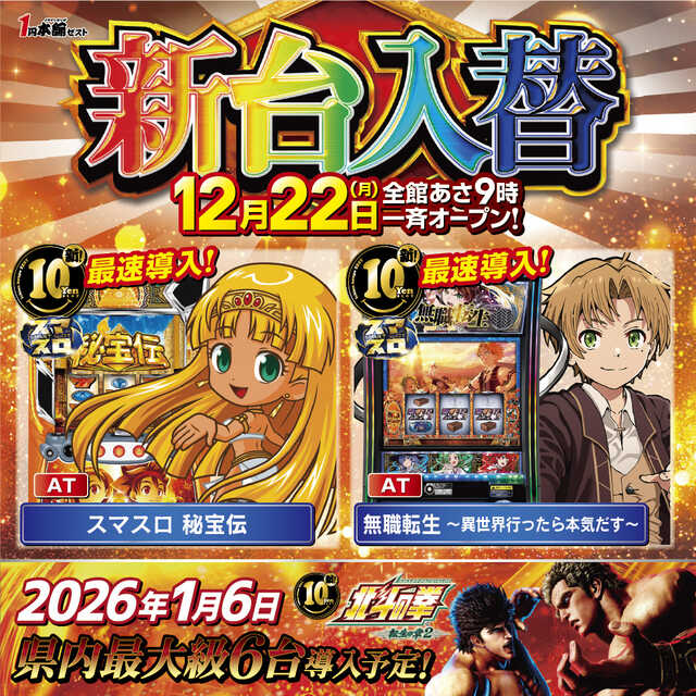 ホーム  >  1円本舗ゼスト  >  12月22日(月) 新台入替